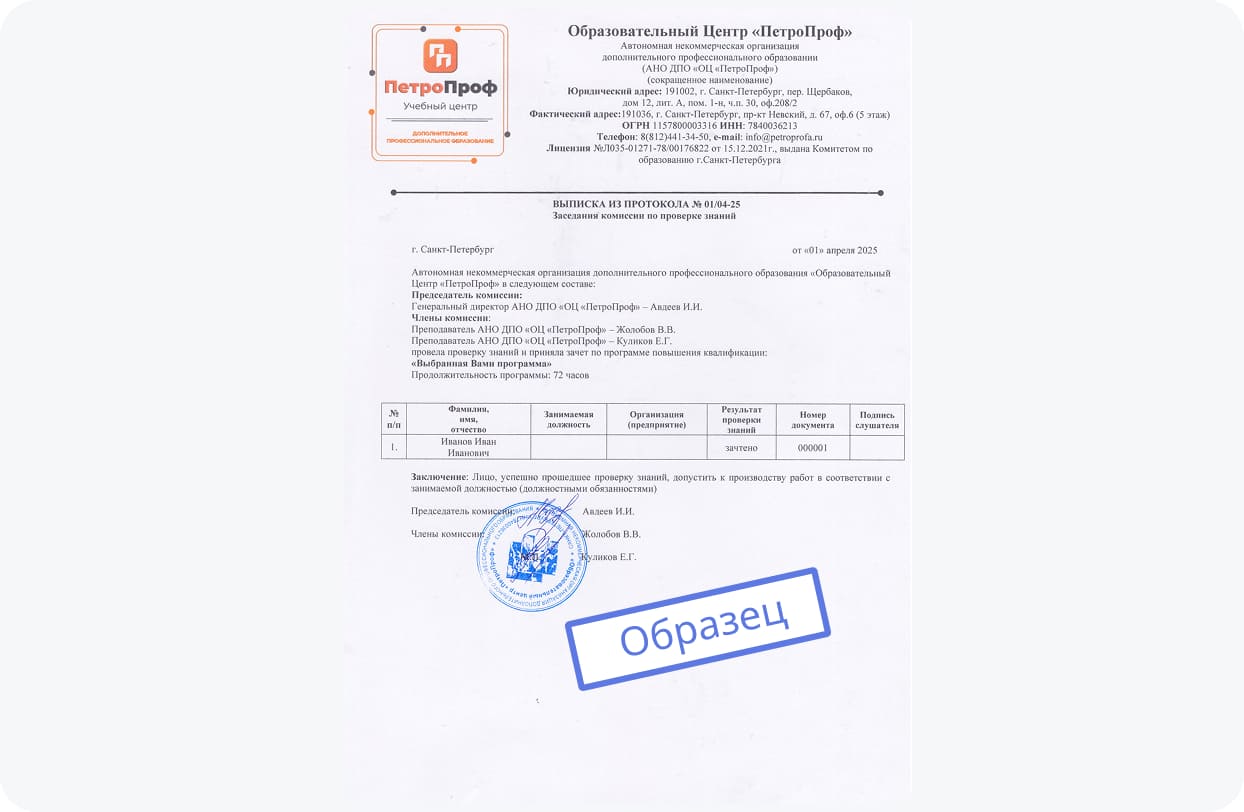 Протокол является важным приложением к основному комплекту документов. Здесь содержатся важные сведения об образовательном центре, программе повышения квалификации, ученике и преподавателях. Он же подтверждает и юридически закрепляет прохождение слушателем переобучения по выбранному направлению. Выдается в бумажном и электронном формате. Также все данные передаются в реестр Минтруда.