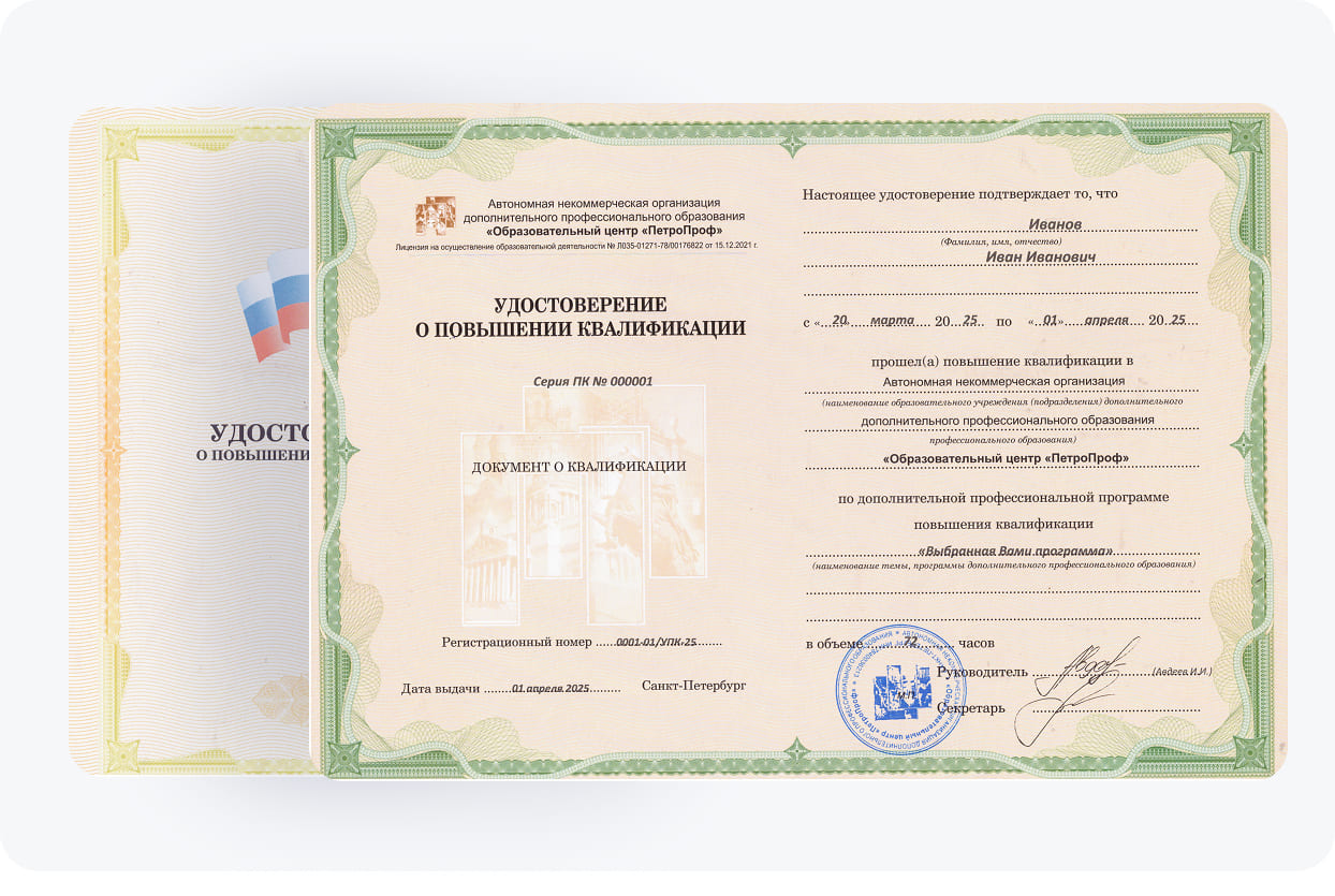 Записаться на курсы могут обладатели высшего и профессионального образования. Обязательным этапом после окончания программы обучения является аттестация. Ее проходят все выпускники для подтверждения полученных компетенций, знаний, навыков и умений. Затем им выдаются необходимые документы для трудоустройства, включая удостоверение о повышении квалификации. Все данные вносятся в Единый реестр. С нами повышение квалификации будет простым, приятным и увлекательным процессом!